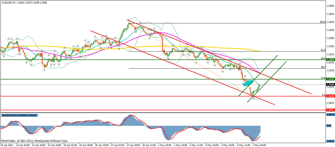 Pretul se afla pe un trend puternic descendent, dupa ce deschiderea sesiunii asiatice a acestei saptamani s-a facut cu un gap negativ pe toate perechile ce contin moneda europeana, alimentand temerile din zona euro ca urmare a schimbarilor din sfera politica. Acest lucru a condus la cumpararea sustinuta a dolarului american in defavoarea celorlalte valute de rezerva. Chiar daca pretul se afla momentan pe o unda corectiva, respingerea din prima rezistenta de astazi, 1.0193 si iesirea din interiorul canalului ascendent, depasind limita inferioara a acestuia, vor oferi un prim semnal de reluare a tendintei descendente. Primul nivel de suport, 1.0109, reprezinta principalul target.