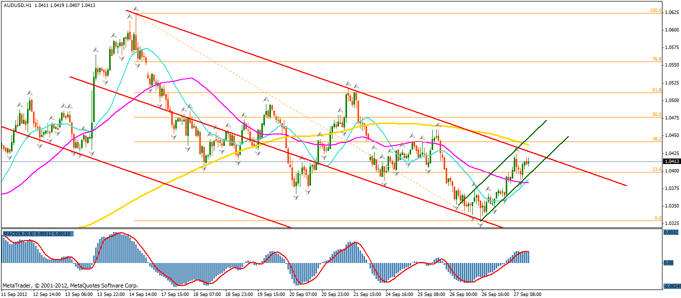 Formarea unor fractali in crestere atat pe zona de maxime cat si pe zona de minime, pe graficul de o ora, trecerea peste mediile mobile de 20 respectiv 50 de perioade precum si spargerea si inchiderea peste nivelului retragerii de 23.6% a trendului descendent 1.0623 – 1.0329 sunt principalele semnale ce ar putea introduce ipoteza formarii unei unde corective ascendente pe termen scurt. Confirmarea iesirii din interiorul canalului de regresie negativ prin inchiderea peste nivelul limitei superioare a acestuia, va reprezenta trigerul pentru validarea undei corective. Targetul principal in cazul acestui scenariu va fi la nivelul retragerii de 61.8% a trendului 1.0623 – 1.0329.