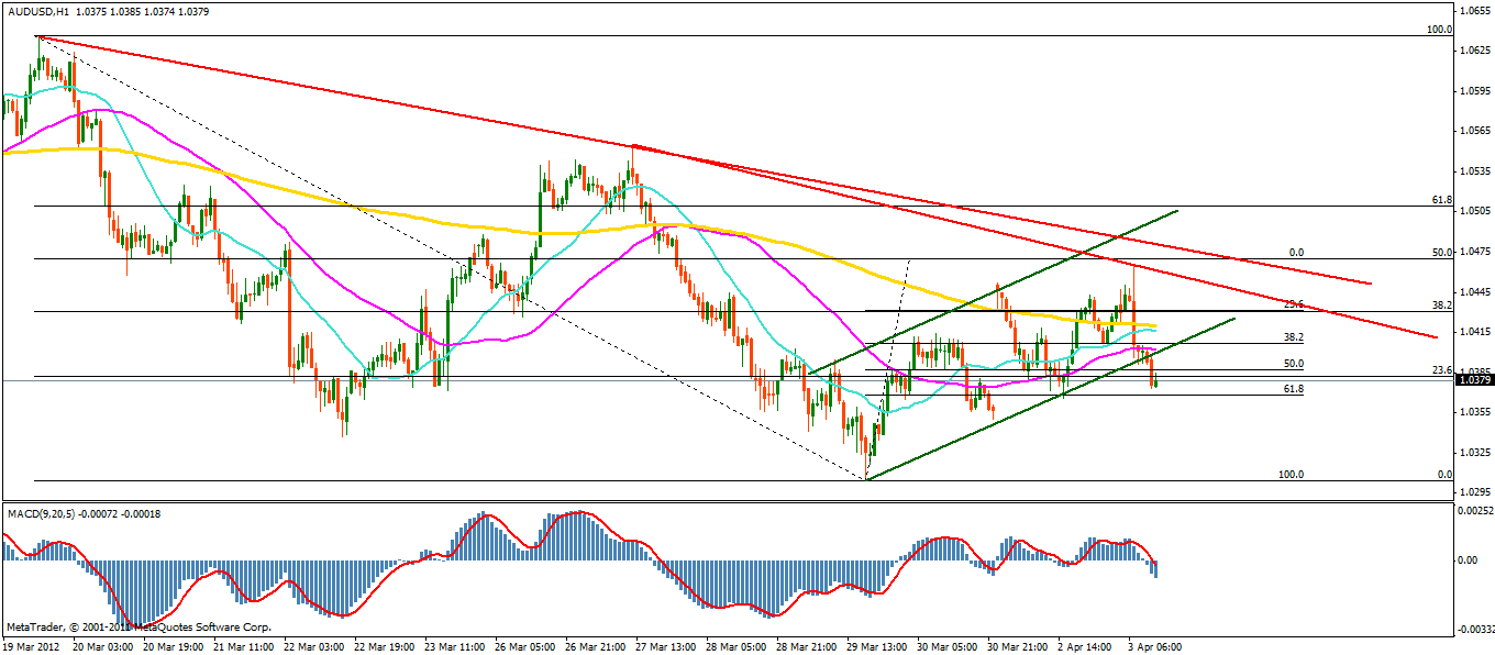 Pe un grafic de 4 ore pretul se afla pe un trend descendent, insa pe graficul orar pretul ramane inca pe o tendinta corectiva. Respingerea din nivelul retragerii de 50% a trendului 1.0304 – 1.0636 respectiv din nivelul liniei de trend descendent, confirma trendul principal negativ. Iesirea din interiorul canalului ascendent precum si inchiderea sub nivelul retragerii de 61.8% a trendului 1.0304 – 1.0470 vor introduce ipotezele continuarii tendintei de scadere.