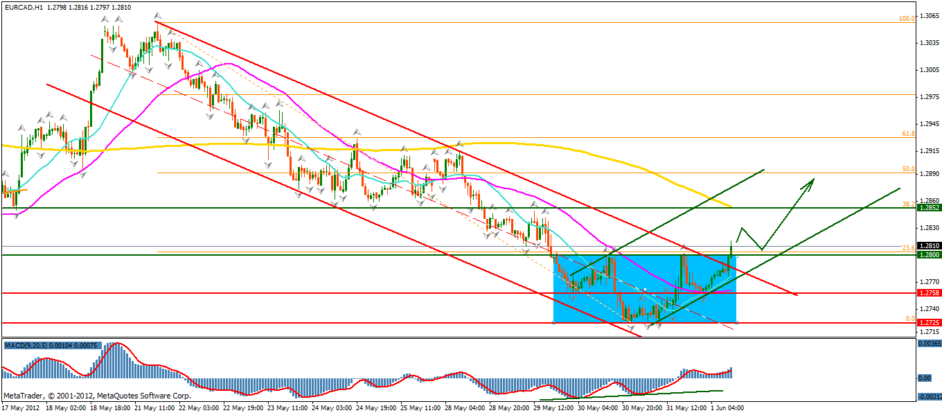 Retestarea nivelului superior al canalului de dispersie descendent precum si nivelul inferior al canalului de dispersie ascendent si inchiderea sub aceste praguri, vor anula scenariul corectiv descris anterior si vor introduce scenariul formarii unei zone laterale, pentru urmatoarea saptamana, ce va avea ca limite 1.2725 – 1.2800. Ca principale zone de confluenta avem nivelul median al canalului de regresie descendent precum si nivelul de suport 1.2758.