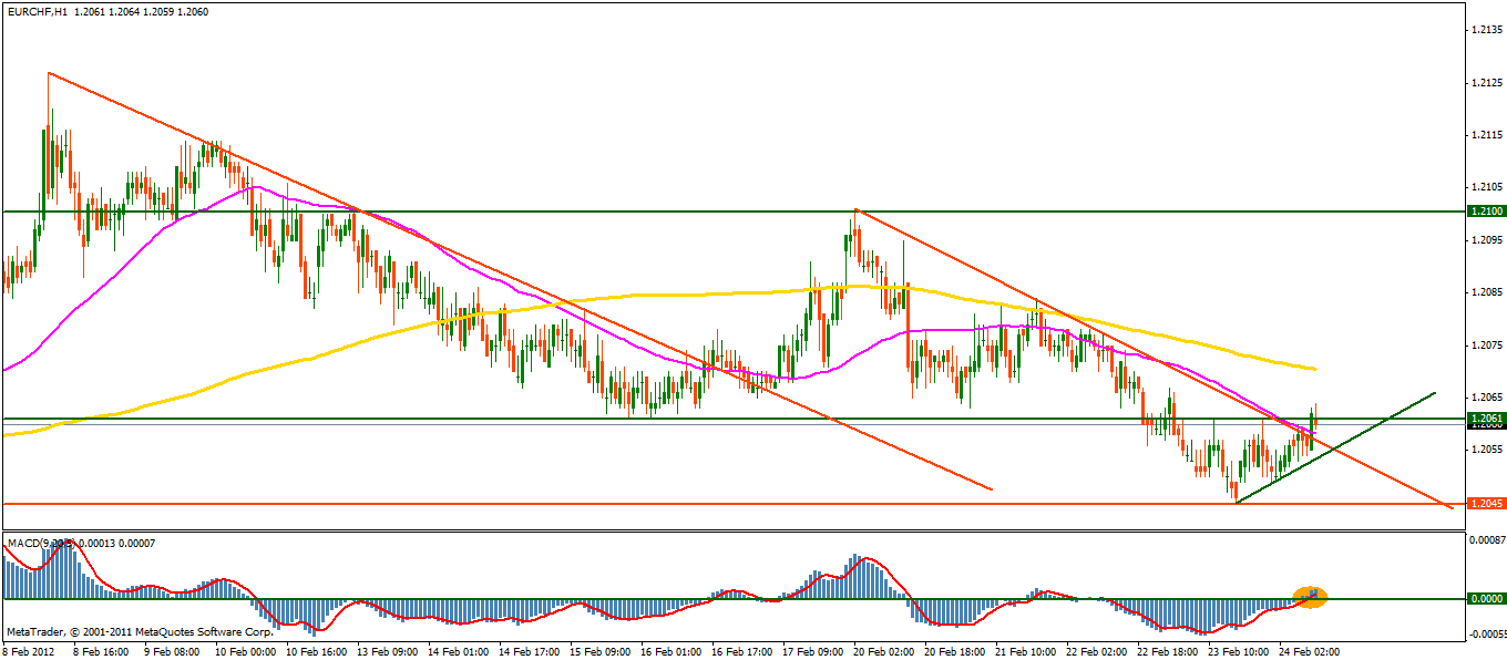 Desi eventuala interventie a bancii centrale a Elvetiei tine in expectativa traderii instrumentului EUR/CHF, pe termen scurt avem un semnal ca pretul ar putea sa-si reia tendinta de crestere. Acesta este dat de trecerea peste nivelul liniei de trend descendent, existand o similaritate fata de trendul anterior. De altfel acest semnal este confirmat si de trecea indicatorului MACD peste 0.
