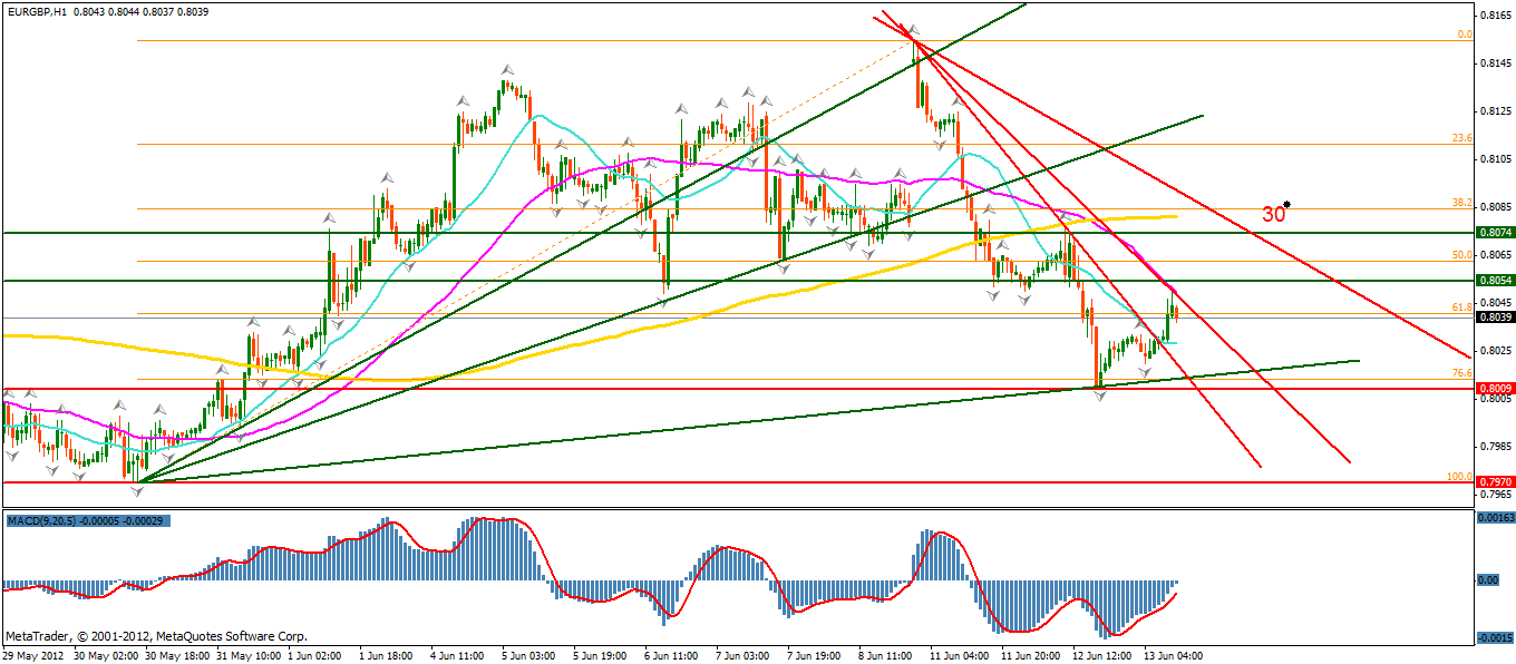 Depasirea primei linii de trend precum si nivelul mediei mobile de 20 de perioade sunt primele semnale de reluare a tendintei de apreciere a monedei europene in fata lirei sterline. Testarea si inchiderea peste cea de-a doua linie de trend, precum si peste nivelul de rezistenta, 0.8054 introduc ipoteza continuarii cresterii cu un target la nivelul liniei de trend descendent ce are o inclinatie de 30⁰, reprezentand o importanta zona de inflexiune, la fel cum, a reprezentat si pe trendul ascendent. Trecerea peste nivelul mediei mobile de 50, respectiv, 200 de perioade va anula ipoteza formarii unui trend descendent si o va intari pe cea a continuarii pe unul ascendent.