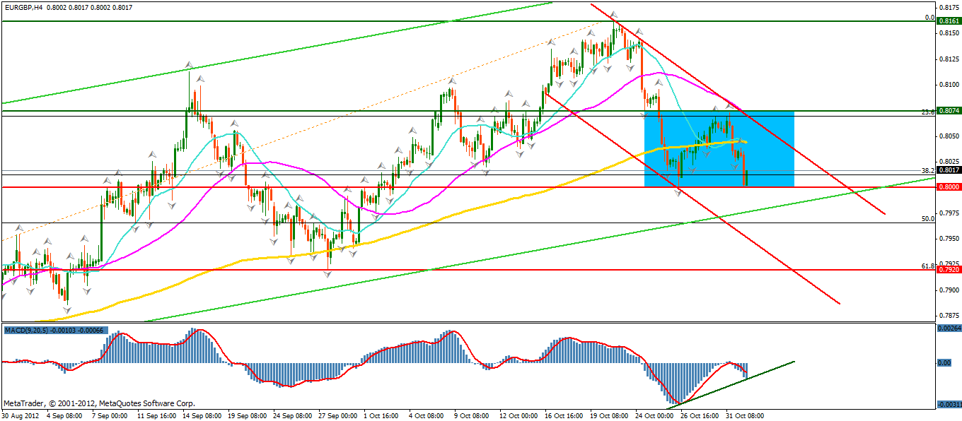 Reluarea tendintei ascendente va fi validata odata cu iesirea din canalul de regresie descendent prin depasirea limitei superioare a acestuia. Formarea unui fractal in crestere pe zona de maxime, peste nivelul de rezistenta, 0.8074 poate reprezenta trigerul initierii unei tranzatii de cumparare. Un target initial, in cazul reluarii scenariului pozitiv, putem stabili la nivelul maximului local anterior, 0.8161. Nivelul superior al canalului de regresie ascendent joaca rolul unui important punct de inflexiune, putand determina formarea unor unde corective descendente odata cu testarea acestuia.