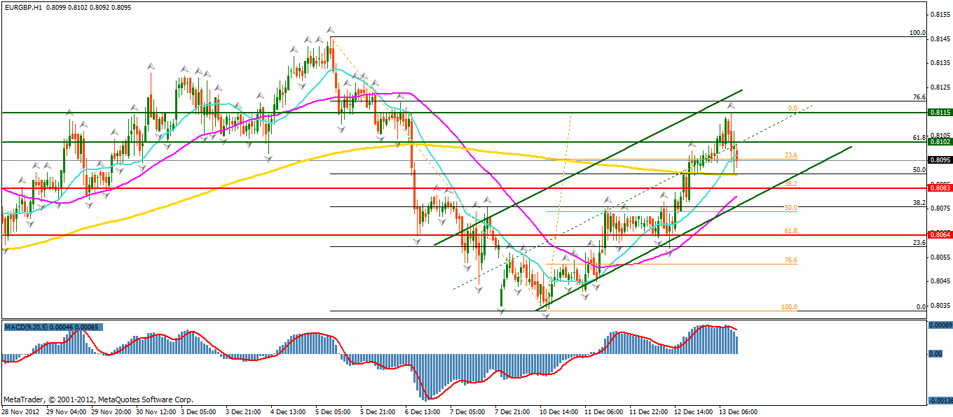 Ramanerea sub nivelul retragerii de 76.6% a trendului descendent 0.8146 – 0.8033 si formarea unei zone de evolutii laterale sub nivelul median al canalului de regresie ascendent sunt primele semnale care vor putea introduce ipoteza formarii unei usoare tendinte corective. Nivelul mediei mobile de 200 de perioade precum si limita inferioara a canalului de trend reprezinta importante puncte de inflexiune si un target initial pentru pret in cazul in care pretul inchide sub nivelul retragerii de 23.6% a undei de impuls 0.8033 – 0.8114. In extensie inchiderea sub nivelul retragerii de 38.2% a aceluiasi trend ascendent va aduce in discutie posibilitatea testarii nivelului 0.8060, reprezentand retragerea de 61.8%. Inversarea trendului ascendent va fi confirmata in cazul in care un nou minim local se va atinge.