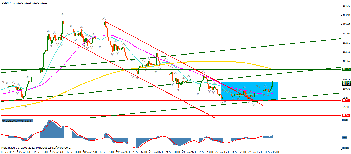 Trecerea peste nivelul liniei de trend descendent, confirmata de formarea unor fractali in crestere pe zona de maxime precum si de trecerea indicatorului MACD peste nivelul 0, ofera imaginea continuarii tendintei laterale. Depasirea nivelului median al canalului de regresie ascendent precum si nivelul de rezistenta 101.26 sunt semnale ce vor confirma formarea unei tendinte ascendente. Targetul initial este la nivelul superior al canalului de trend ascendent.