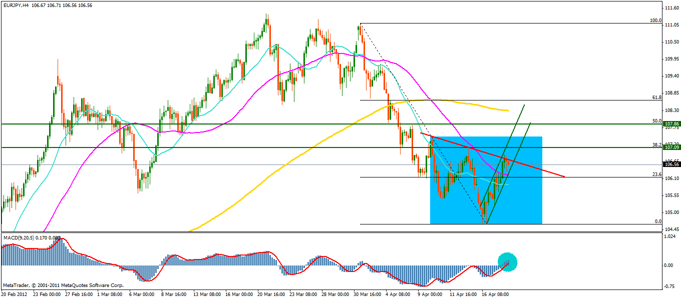 Pretul se afla pe o unda corectiva ascendenta, dupa o scadere ampla de peste 600 de puncte pe parcursul ultimelor 3 luni. Daca limitele canalului ascendent raman intacte, putem asista la o crestere rapida a pretului in urmatoarele zile. Retragerile Fibonacci de 38.2%, respectiv, 50% ale trendului 111.12 – 104.63 reprezinta principalele puncte de inflexiune la nivelul carora pretul poate intampina rezistenta. Trecerea peste nivelul celor doua medii mobile rapide, de 20, respectiv, de 50 de perioade, cat si peste nivelul 0 a indicatorului MACD, sunt primele semnale ca pretul ar putea continua pe unda corectiva.
