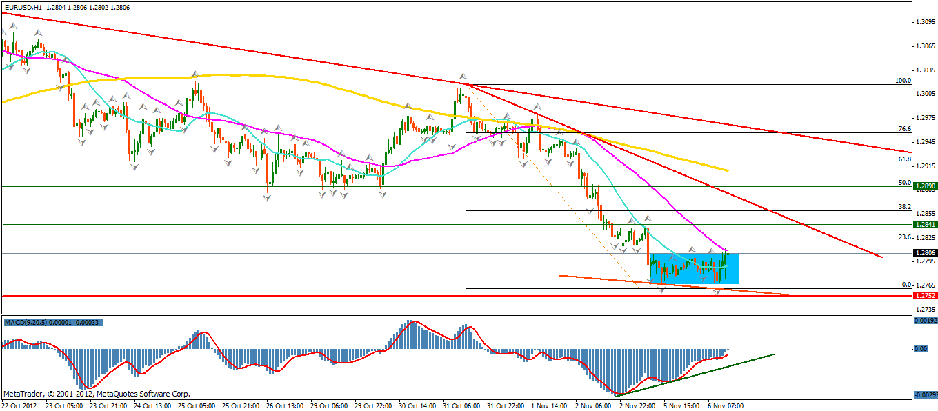 Formarea unei zone de consolidare in evolutia pretului din ultimele ore, precum si divergenta pozitiva existenta intre graficul pretului si cel al indicatorului MACD sunt primele semnale ce ar putea introduce ipoteza formarii unei unde corective ascendente. Confirmarea acestui scenariu vine odata cu depasirea nivelului superior a zonei de consolidare, respectiv cu trecerea mediei de 20 de perioade peste cea de 50. Targetul initial in cazul acestui scenariu se afla la nivelul unei rezistente intermediare, intre nivelurile de retragere de 23.6% respectiv 38.2% a trendului descendent anterior, 1.3017 – 1.2761. In extensie nivelul retragerii de 50% a aceluiasi trend descendent anterior reprezinta urmatorul target al pretului. Linia de trend descendent intermediar reprezinta o zona de inflexiune destul de importanta, care daca va fi depasita va duce la reluarea tendintei ascendente.
