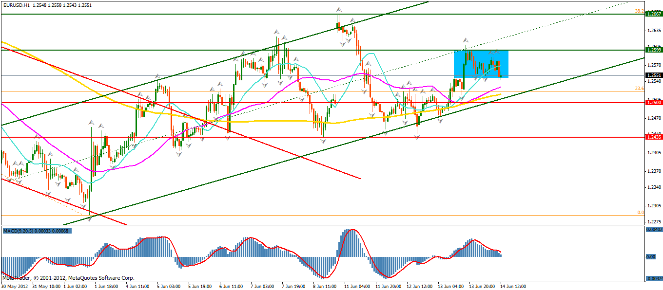 Formarea unei zone de consolidare, precum si a unor fractali in scadere atat pe zona de maxime cat si pe zona de minime, reprezinta primele semnale ce sustin continuarea evolutiei laterale cu o tenta descendenta. Trecerea sub nivelul mediei mobile de 20 de perioade confirma aceasta tendinta pe termen scurt. Iesirea din zona de consolidare prin spargerea limitei inferioare genereaza ipoteza testarii nivelului inferior al canalului de regresie ascendent. Inchiderea sub acest nivel precum si trecerea sub nivelul de suport 1.2500, ce reprezinta un prag psihologic important, vor activa scenariul negativ ce va avea ca principal target minimul atins anterior, 1.2288.