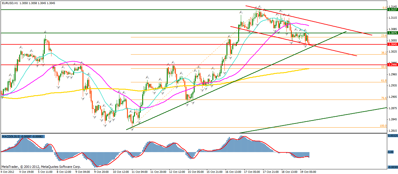 Respingerea si ramanerea deasupra nivelului liniei de trend ascendent precum si a nivelului inferior al canalului de regresie negativ, poate duce la mentinerea unei tendinte laterale a cotatiei eur/usd. Reluarea tendintei ascendente va fi confirmata de depasirea rezistentei, 1.3075 si de trecerea indicatorului MACD peste nivelul 0. Targetul initial va fi la nivelul superior al canalului de trend descendent si in extensie la nivelul maximului local anterior, 1.3137.