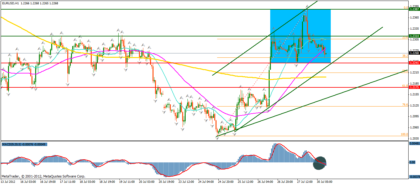 Dupa o perioada lunga de deprecieri ale monedei europene in fata dolarului american, pretul a inceput o perioada corectiva, confirmata de iesirea pretului din interiorul zonei de consolidare 1.2040 – 1.2160 prin depasirea limitei superioare. Trecerea pretului deasupra mediilor mobile de 50 respectiv de 200 de perioade, precum si trecerea mediei de 50 de perioade peste cea de 200 pot fi principale semnale ce confirma unda ascendenta. Ramanerea in interiorul canalului de regresie ascendent si formarea unor fractali in crestere va introduce ipoteza continuarii undei corective. Nivelul rezistentei 1.2314 reprezinta principalul target al sesiunii de astazi in cazul in care pretul isi continua tendinta pozitiva. In extensie, urmatoarea tinta o reprezinta nivelul maximului local anterior, 1.2388.