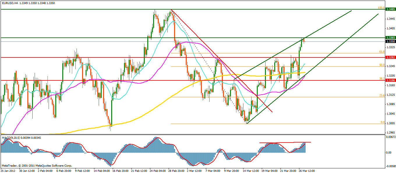 Dupa o perioada de consolidare, cu o volatilitate destul de ridicata atat pe trend descendent, cat si pe trend ascendent, perechea eur/usd a reusit sa depaseasca pragul psihologic 1.3300. Evolutia de pe parcursul sesiunii de ieri introduce ipoteza unei inversari de trend, prin depasirea retragerii de 61.8% a trendului 1.3485—1.3003, respectiv prin atingerea unui nou maxim local.