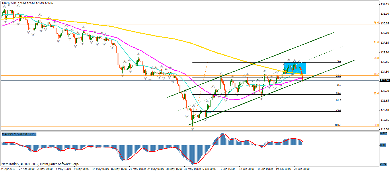 Trecerea sub nivelul mediei mobile de 200 de perioade precum si testarea nivelului inferior al canalului de regresie pozitiv sunt primele semne ce confirma formarea unei unde descendente. Divergenta dintre graficul pretului si indicatorul MACD confirma aceasta unda corectiva a trendului ascendent. Formarea unor fractali in scadere pe zona de maxime si iesirea din range-ul format pe trendul ascendent valideaza acest scenariu. Retragerea de 38.2% si in extensie cea de 50%, a trendului 118.81 – 125.82 reprezinta principale tinte ale pretului pe unda descendenta.