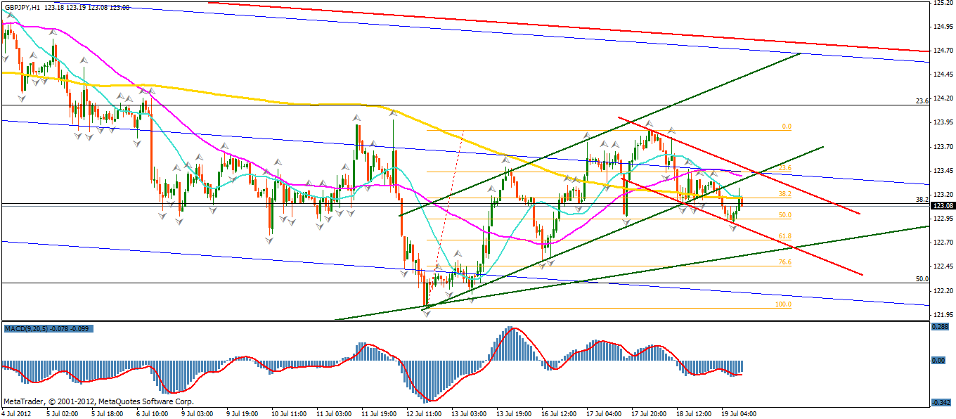 Trecerea peste nivelul superior al canalului de regresie descendent precum si peste nivelul median al pitchfork-ului trasat pe graficul de 4 ore, avand confirmarea trecerii indicatorului MACD peste nivelul 0, reprezinta importante semnale de reluare a undei ascendente. Respingerea din nivelul retragerii de 50% a trendului principal ascendent 118.78 – 125.78 (de pe graficul de 4 ore) precum si din retragerea de 50% a trendului ascendent anterior 122.02 – 123.87 (de pe graficul orar) reprezinta confirmarea formarii undei pozitive. Targetul principal pentru aceasta unda il reprezinta maximul local anterior, 123.87.