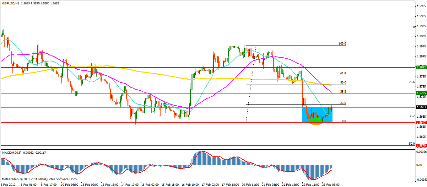 In cazul in care pretul nu poate depasi retragerea de 23.6% si va ramane in zona de consolidare 1.5650 – 1.5700 putem introduce ipoteza continuarii tendintei descendente in cazul in care minimul anterior (1.5647) va fi depasit.