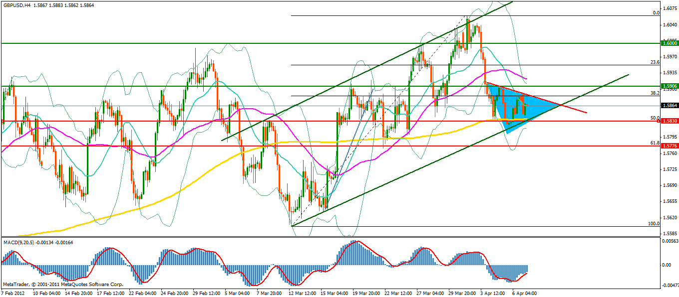 Retragerea de 61.8% a aceluiasi trend ascendent, reprezinta urmatorul suport care odata depasit va introduce ipoteza inversarii tendintei principale. Targetul in cazul unui scenariu descendent va fi la nivelul retragerii de 76.6% si in extensie la nivelul minimului anterior, 1.5601. Iesirea din interiorul triunghiului simetric, atat prin depasirea limitei superioare, cat si prin depasirea limitei inferioare va confirma continuarea tendintei in directia respectiva. Ingustarea benzilor Bollinger ofera semnalul unei evolutii laterale.