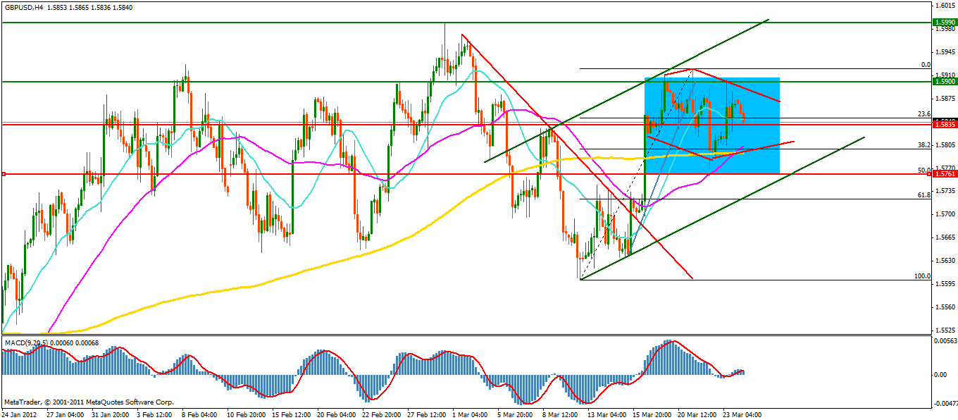 Evolutia din ultima perioada incadreaza pretul intr-o zona de consolidare ale carei limite reprezinta importante puncte de confluenta. Pretul se afla pe o tendinta generala ascendenta, confirmand acest scenariu prin depasirea retragerii de 61.8% a trendului descendent 1.5990 – 1.5601. Nivelul primei rezistente de astazi 1.5900, reprezinta un important punct de inflexiune, pretul testand in mai multe randuri si nereusind o spargere clara. In cazul in care pretul reuseste sa depaseasca acest prag, putem introduce ipoteza testarii maximului ultimelor 4 luni, 1.5990.