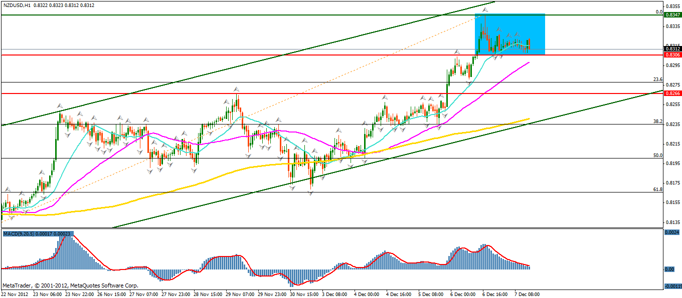 Formarea unei zone de consolidare in ultimele ore, prin identificarea unor fractali in scadere pe zona de maxime este primul semnal ce introduce ipoteza unor evolutii laterale. Depasirea nivelului inferior al acestei zone va duce la continuare tendintei descendente. Formarea unei lumanari de tip hammer in maximul trendului reprezinta un alt indiciu ce ar putea valida formarea undei corective. Targetul initial poate fi stabilit la nivelul retragerii de 23.6% a trendului ascendent anterior, 0.8053 – 0.8347, iar in extensie putem stabili ca tinta dinamica, nivelul inferior al canalului de regresie ascendent, respectiv nivelul mediei mobile de 200 de perioade.