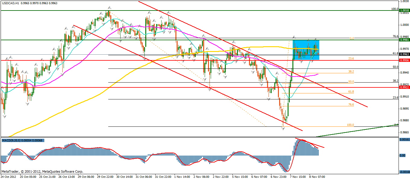 Pretul formeaza o zona de consolidare, dupa ce a parcurs o tendinta rapida de crestere ca reactie la o apreciere a dolarului american in fata celorlalte valute majore. Evolutia in jurul mediei mobile de 200 de perioade precum si formarea unor fractali la niveluri apropiate, atat pe zona de maxime cat si pe zona de minime mentin activa ipoteza continuarii tendintei laterale pe termen scurt. Iesirea din canalul de regresie descendent prin depasirea limitei superioare a acestuia precum si trecerea peste nivelul retragerii de 61.8% a trendului descendent anterior, 1.0018 – 0.9872 pot fi un prim semnal ca pe termen lung pretul ar putea avea o evolutie pozitiva. Acest scenariu va intra in discutie odata cu inchiderea pretului peste nivelul retragerii de 76.6% respectiv peste nivelul mediei mobile de 200 de perioade.