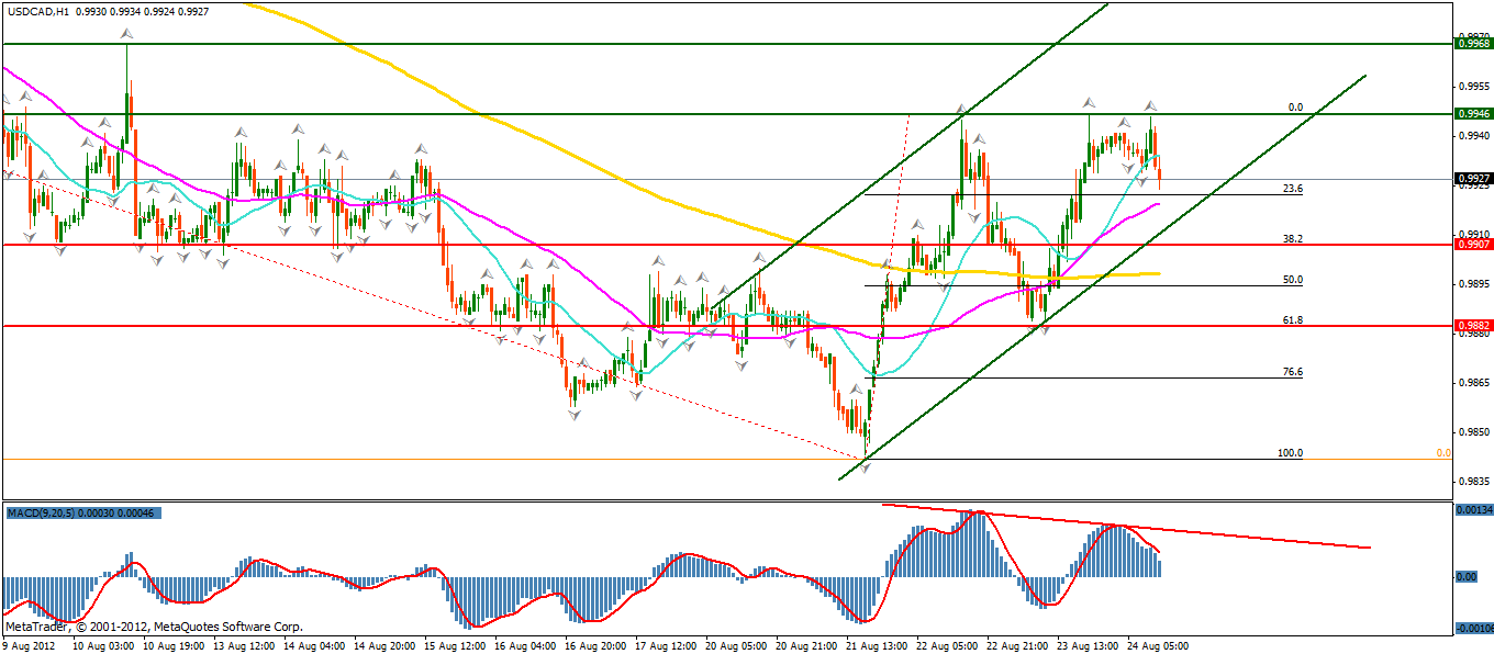 Divergenta dintre graficul pretului si indicatorul MACD ar putea reprezenta un prim semnal de reluare a tendintei de scadere. Principalul target este dat de nivelul inferior al canalului de regresie ascendent, cat si de nivelul de retragere de 38.2% a trendului ascendent 0.9842 – 0.9946. Trecerea sub nivelul mediei mobile de 200 de perioade introduce un nou target extins la nivelul retragerii de 61.8% a aceluiasi trend ascendent.