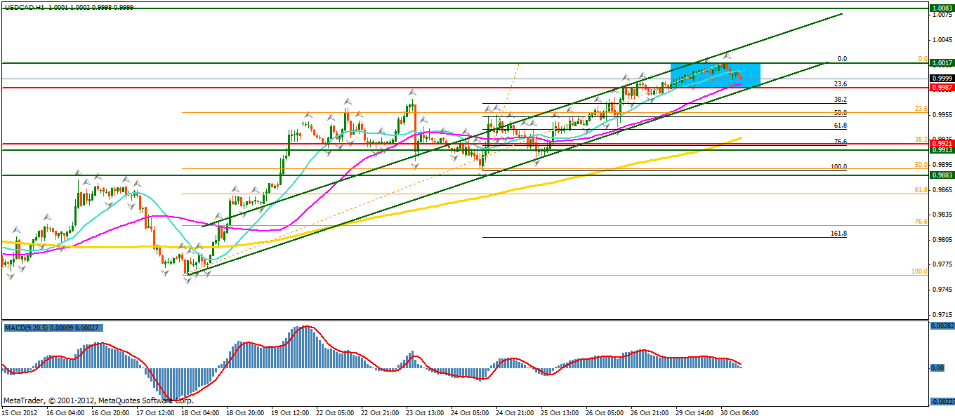 Pretul formeaza o zona de consolidare, dupa ce a parcurs o tendinta consolidata de crestere. Formarea unui prim fractal in scadere pe zona de minime si trecerea pretului sub nivelul mediei mobile de 20 de perioade reprezinta primele semnale de incetinire a tendintei ascendente si definirea unei perioade de evolutii laterale. Nivelul 1.0000 reprezinta un important prag psihologic, sub care, daca pretul va reusi sa inchida ziua de astazi, vom putea vedea conturarea unei unde corective descendente. Nivelul retragerii de 23.6% a undei ascendente intermediare, 0.9888 – 1.0017, parte a trendului ascendent principal, 0.9762 – 1.0018, impreuna cu nivelul liniei de trend ascendent, joaca rolul unei importante zone de suport. Dace pretul va reusi sa depaseasca aceasta zona, vom avea confirmarea formarii undei descendente, ce are ca potential target, nivelul retragerii de 50% a trendului ascendent principal.