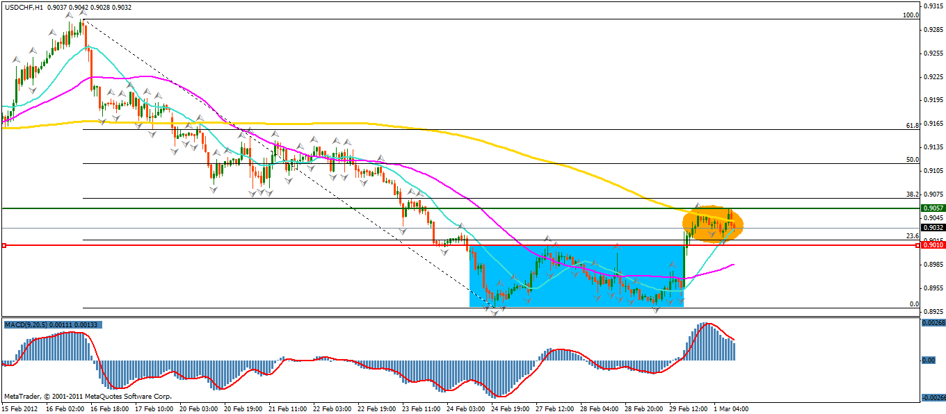 Dupa o tendinta consolidata de apreciere a francului elvetian in fata dolarului american, perechea usd/chf a intrat pe o unda corectiva. Formatiunea double bottom formata pe parcursul ultimelor doua saptamani va fi validata daca pretul va retesta nivelul 0.9010 si va continua trendul de crestere. Ca potential target avem nivelul 0.9100. Maximul anterior 0.9057, respectiv retragerea de 38.2% a trendului 0.9299 – 0.8930 reprezinta importante praguri de inflexiune.