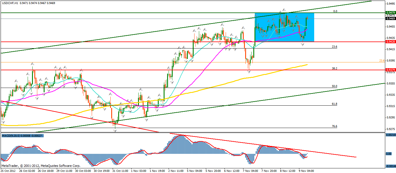 Pretul traverseaza o perioada laterala in interiorul intervalului 0.9428 – 0.9479. Tendinta principala ramane una ascendenta, dupa ce pretul a trecut peste nivelul unei linii de trend descendent trasate pe graficul de 4 ore, cat si peste nivelul mediei mobile de 200 de perioade. Limitele canalului de regresie ascendent reprezinta principale puncte de inflexiune avand in vedere evolutia istorica a pretului in jurul acestor niveluri. Iesirea din zona actuala de consolidare prin depasirea limitei superioare, impreuna cu confirmarea de inchidere peste nivelul superior al canalului ascendent sunt principale semnale ce vor duce la continuarea tendintei ascendente. Targetul initial poate fi stabilit la nivelul retragerii de 38.2% a trendului descendent principal trasat pe graficul zilnic: 0.9970 – 0.9214.