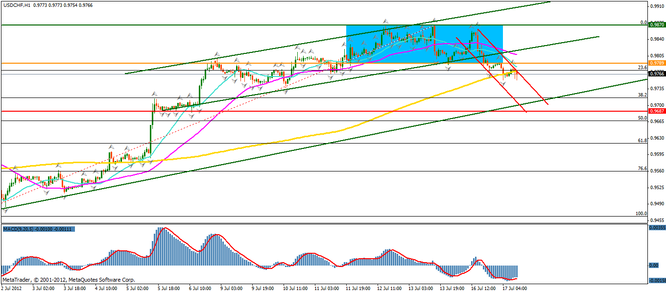 In cazul in care pretul va iesi din interiorul canalului de regresie descendent prin spargerea limitei superioare, vom introduce ipoteza reluarii tendintei ascendente, cu principal target nivelul maximului local anterior. Primul semnal ce va confirma continuarea tendintei pozitive este dat de inchiderea peste nivelul mediei mobile de 200 de perioade si respectiv peste linia de semnal aflata la nivelul 0.9789.
