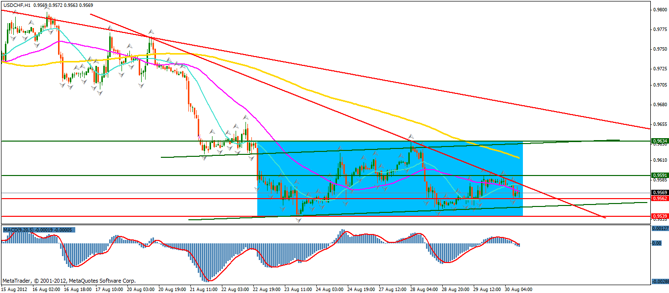 Dupa o evolutie descendenta inceputa la sfarsitul lunii iulie, pretul a intrat intr-o zona de consolidare, cuprinsa in intervalul 0.9539 – 0.9634. Formarea unor fractali in crestere pe zona de minime si trecerea mediei mobile de 20 de perioade peste cea de 50, poate introduce ipoteza contiuarii evolutiei laterale cu un potential target la nivelul superior al zonei de consolidare, avand in vedere ca pretul se afla la limita inferioara a acestuia. Acest scenariu va fi confirmat daca pretul reuseste sa depaseasca nivelul liniei de trend descendent secundar precum si nivelul reistentei 0.9591, ce reprezinta nivelul median al zonei de consolidare. Un prim semnal de inversare a trendului va fi dat de inchiderea peste nivelul liniei de trend descendent principal.
