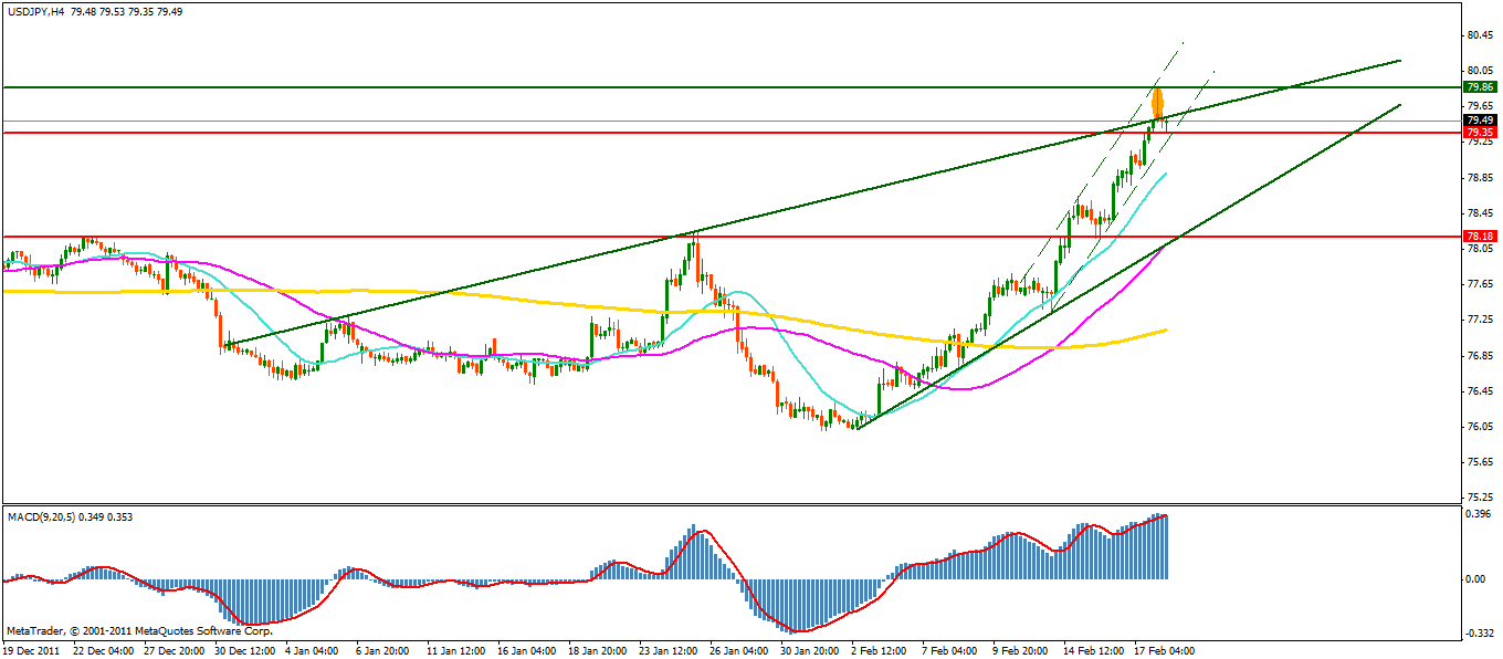 Avand in vedere formarea unui “hammer” pe graficul de 4 ore putem evidentia o eventuala unda corectiva a trendului ascendent. Un alt semnal ce va confirma acest scenariu il reprezinta trecerea sub pragul de suport 79.35 respectiv sub nivelul inferior al canalului de trend ascendent.