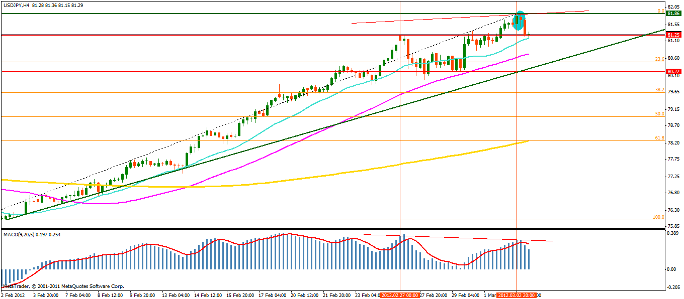 Identificarea pe graficul de 4 ore a formatiunii bearish tweezer top, prin testare in doua randuri a nivelului 81.86 fara a-l depasi si divergenta dintre graficul pretului si cel al indicatorului MACD sunt primele semnale ca pretul poate intra pe o unda corectiva. Principalul target pentru acest scenariu il reprezinta intervalul 80.22 – 80.50 (dat de retragerea de 23.6% a trendului 76.03 – 81.86). Nivelul celor doua medii mobile rapide, de 20, respectiv 50 de perioade, pot reprezenta puncte de inflexiune.